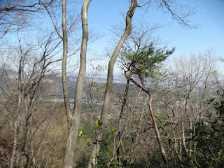 この福神山から10分程歩いてタヌキ糞2(図13)だ!ここを過ぎてから少し鞍部になっており谷太郎川に下りるような道らしきものもある。この辺りもも古い道が入り組んでいる。昔の人たちはこのような鞍部を通行の要にしていたんだ。この鞍部を過ぎてから尾根には仕事道用に階段にはなっているが、登りは急で、ゼイゼイ言いながらストックを使い腿を上げる。来た北方を振り返ると煤ケ谷方面の街が見える(図14)。