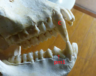 大きな上下の犬歯は互いに擦り減る Large upper and lower canine teeth abrade against each other