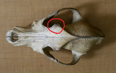 図3.イヌ頭骨上面からの後眼窩突起(赤線で囲む)