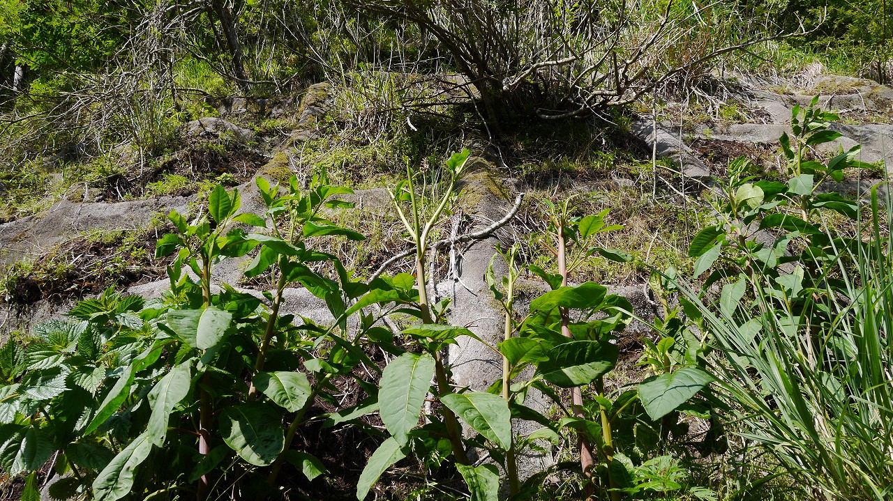 林道山側の石垣の上や下に生えているヨウシュヤマゴボウがシカかカモシカに