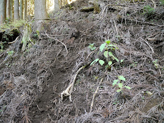 渡渉後すぐ登る。しばらく沢の左岸に沿って斜面の中腹を歩くが、酷く崩壊した場所にぶつかり、